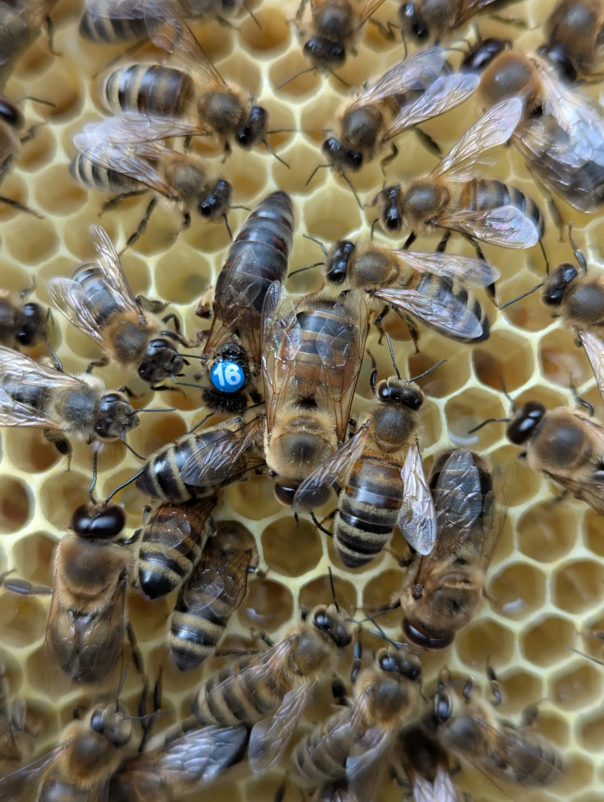 - Die Mutter der F1-Königin stammt aus einer kontrollierten Zucht – sie ist eine Reinzuchtkönigin, die gezielt mit Drohnen einer bestimmten Linie instrumentell oder isoliert begattet wurde.